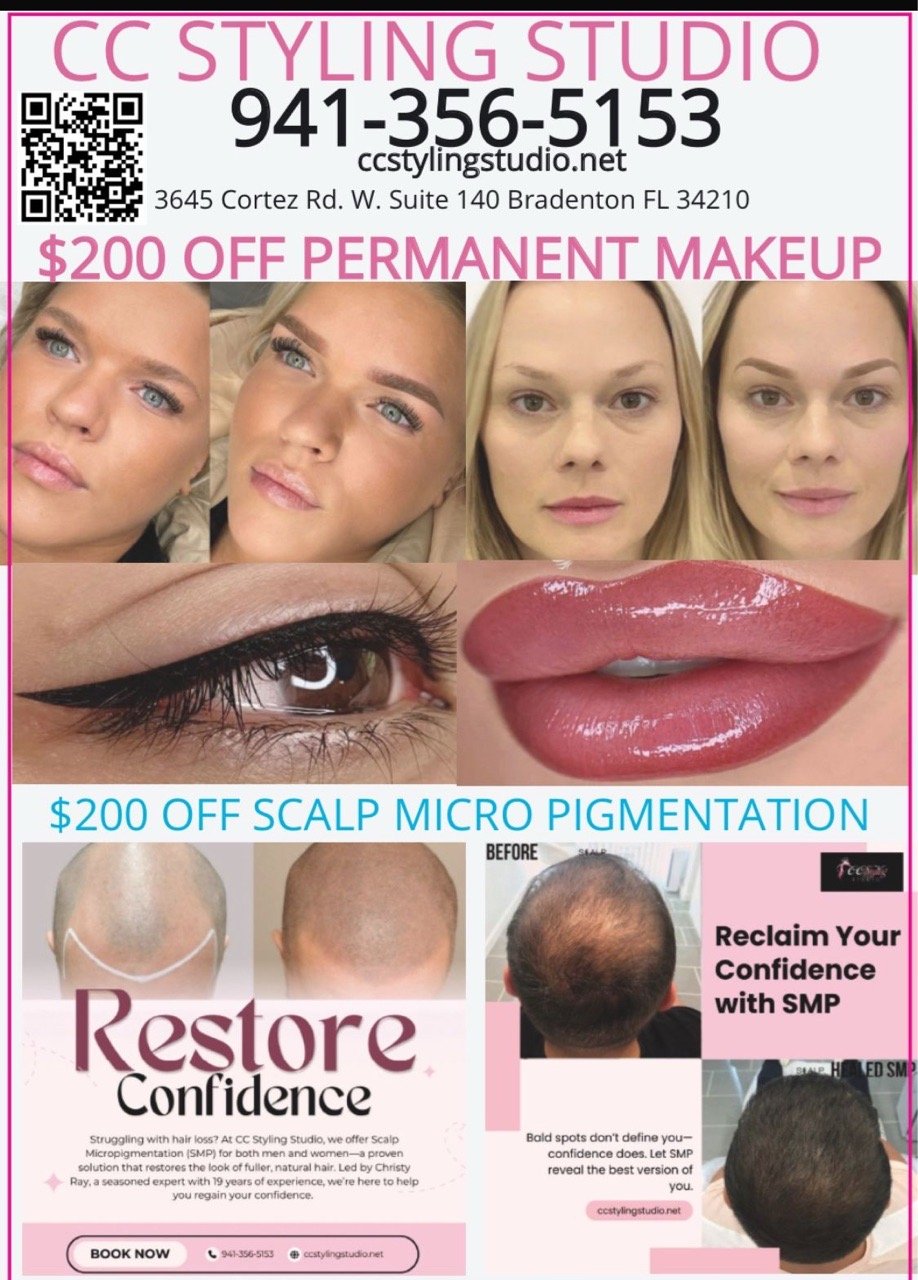 Welcome to CC Styling Studio, your top destination for transformative beauty services in Bradenton, FL. Looking for a hair salon near me? We specialize in expert hair styling, offering fashionable cuts and creative color solutions tailored just for you. Additionally, our permanent makeup and scalp micro-pigmentation services empower you with confidence and lasting beauty. As a local mother-daughter team with over 19 years of experience, we prioritize your satisfaction and aim to create looks you'll love. Come discover what sets us apart and experience personalized consultations that result in stunning transformations. Don’t miss out—book your appointment today and unveil your best self! CC Styling Studio was voted #1 Salon in Bradenton Fl.